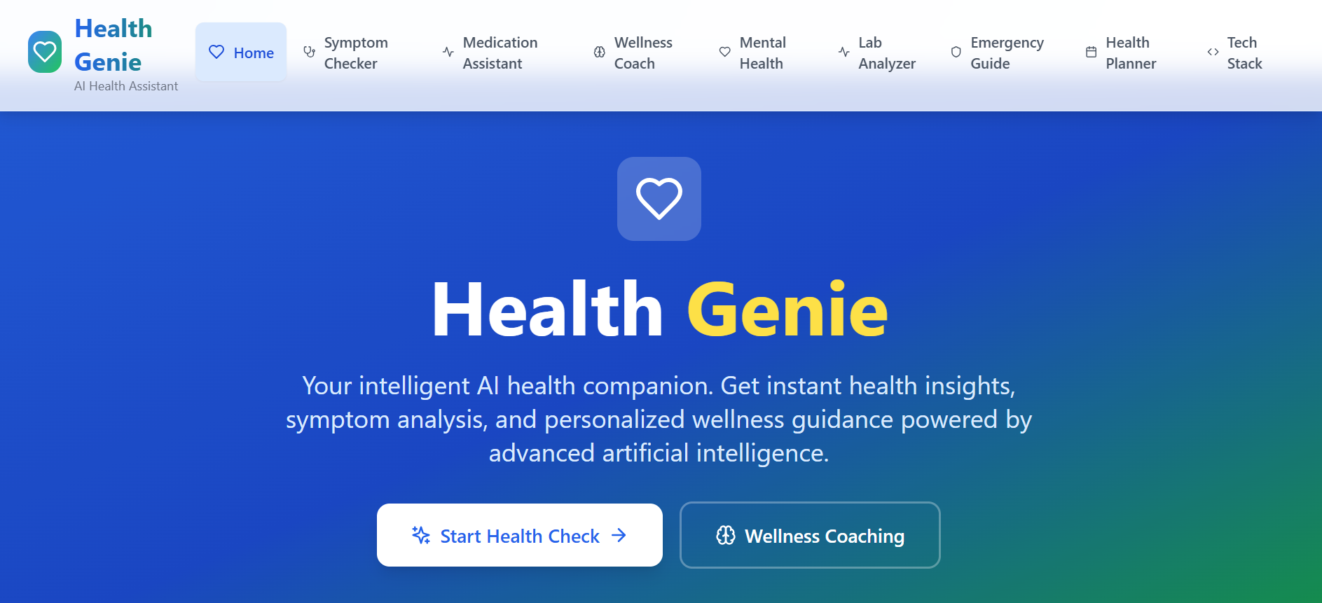 Health Geniee is an AI-driven web application designed to make health awareness accessible to everyone. It intelligently analyzes user-provided symptoms to predict possible health conditions and offers personalized recommendations for lifestyle improvement. The project successfully combines machine learning and modern web technologies to create a practical, user-friendly tool that empowers individuals to take early action regarding their health. By integrating AI models into a web interface, Health Geniee bridges the gap between complex medical data and everyday users. Despite challenges in data handling, model accuracy, and deployment, the system demonstrates how technology can simplify healthcare access and promote proactive well-being. In essence, Health Geniee transforms raw health data into meaningful, actionable insights — guiding users toward a healthier life.